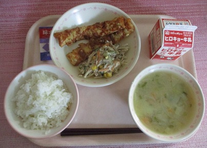 3月13日(金) ごはん 牛乳 ひろしまアゲアゲちくわ ごぼうサラダ 3月のみそ汁 ふりかけ |