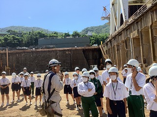 6月30日(木) ■1年生が,総合的な学習の時間の「海事産業ものづくり体験学習」の一環として,警固屋船渠株式会社の警固屋ドックでの進水式を見学しました。 |