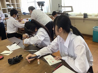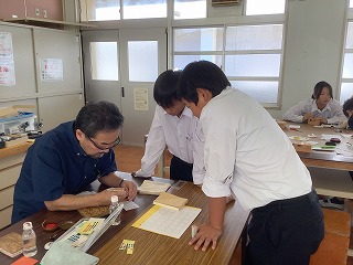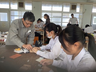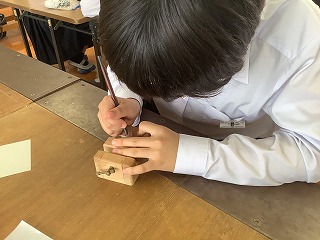 10月1日(水) ■1年生が、広島県職業能力開発協会が主催する「ものづくりの魅力発信」出前授業を受講しました。一級印章彫刻技能士である5名のものづくりマイスターから「落款」の実技指導を通してものづくりの技術と楽しさを教えていただきました。 |