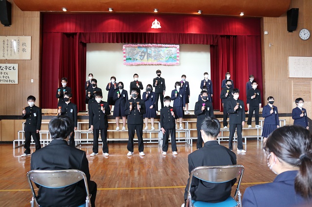 ・コロナウイルスでいつも通りの生活ができなくて,文化祭も去年とは違うかたちでやったけど,楽しくできた。ハンドベルで練習の時はあまりうまくできなかったけど,本番ではうまくできたので,達成感を感じた。