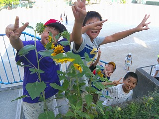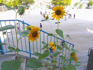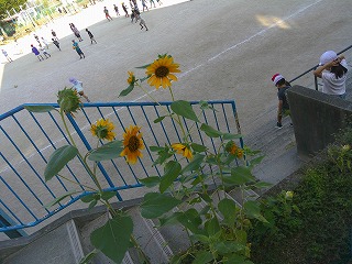 休憩時間終わりのチャイムがなって、階段を上がってきたときの子供たちとヒマワリです。