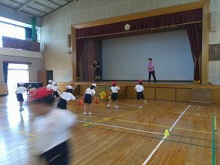 そして,先頭の子が,ステージの上に立っている先生のできるだけ高い位置に渡すシュート練習。