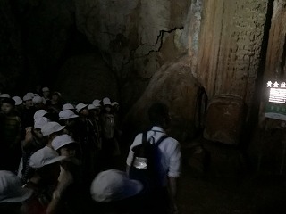 洞に入る前、川のように水が流れ出た水の様子を見て「水がきれい!」「青い! 」。洞内に入ると「これが自然にできたとは思えない!」 そんな子供たちの声。