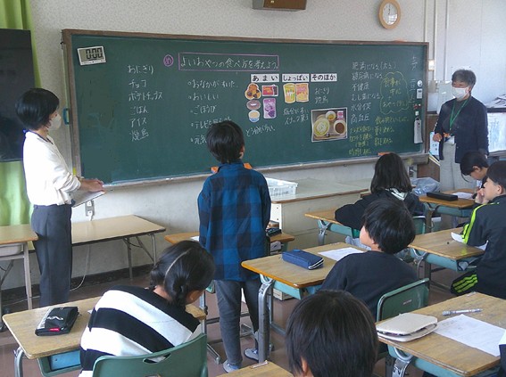 4年生が、食育の授業で、栄養士の先生に来校していただき、「よいおやつの食べ方」について考えました。