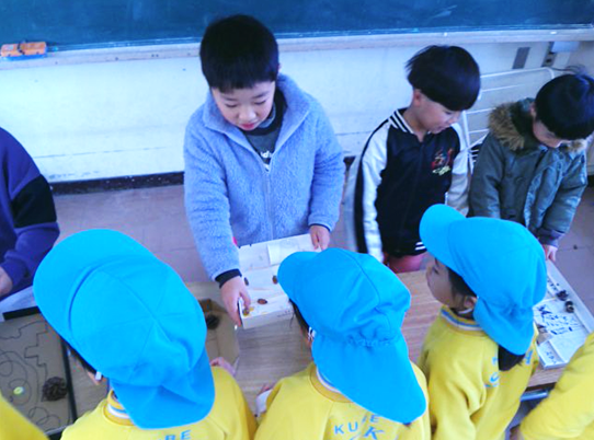 「見よってよ。」と言ってやり方を教える1年生。