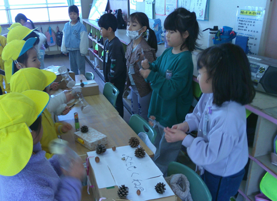最後の終わりの会では、1年生さんが作った「どんぐりペンダント」を年長さんにかけてあげてプレゼントをしました。