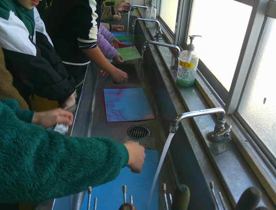 まず、板に付けた色を水で落とします。