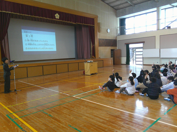 この日の全校朝会は「保健朝会」で、栄養士の先生から「給食」についてのお話をしていただきました。
